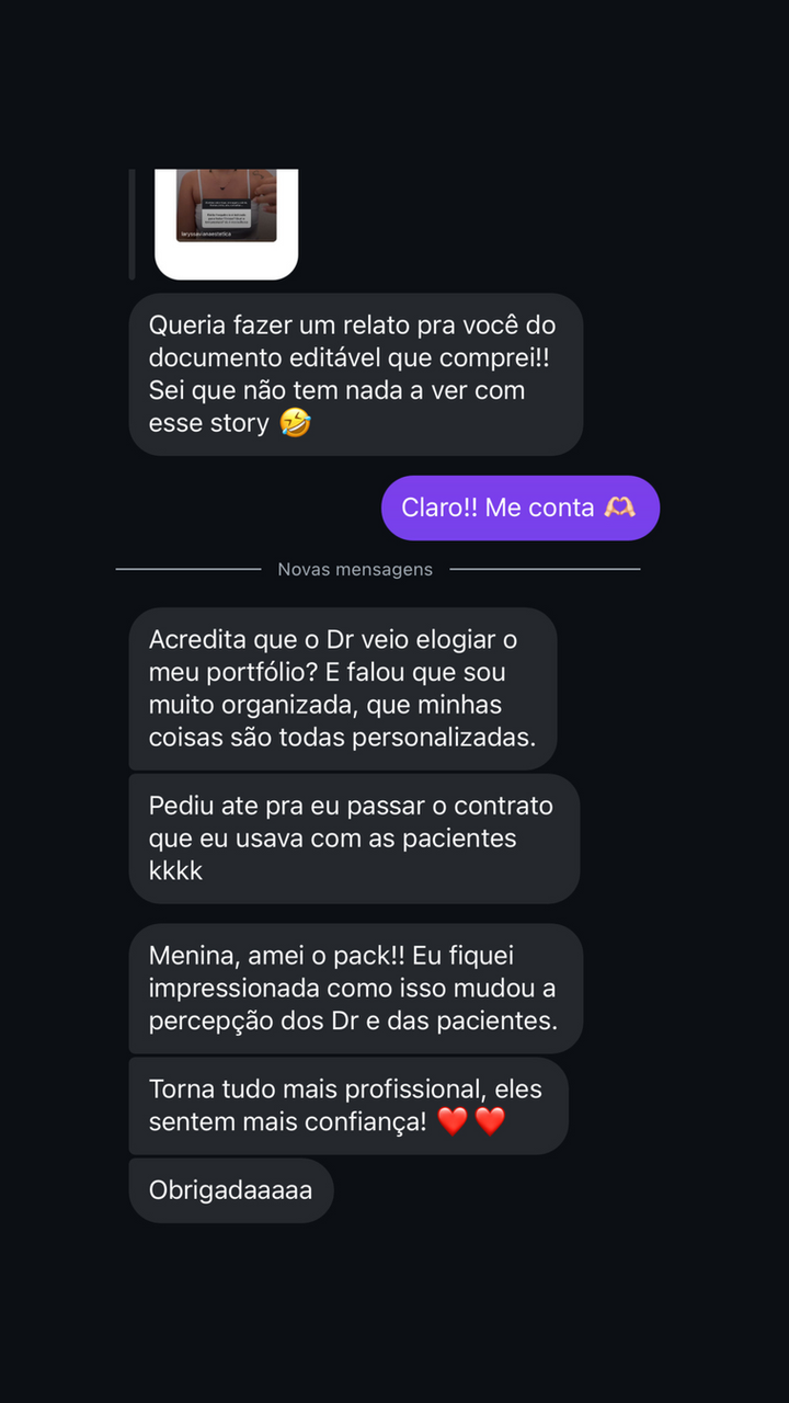 Por isso, criamos um Pacote de Documentos Editáveis com mais de 20 arquivos essenciais, como anamneses, contratos e portfólios. Além de otimizar seu trabalho, os contratos oferecem segurança, protegendo seus direitos e resguardando seu relacionamento com os pacientes.